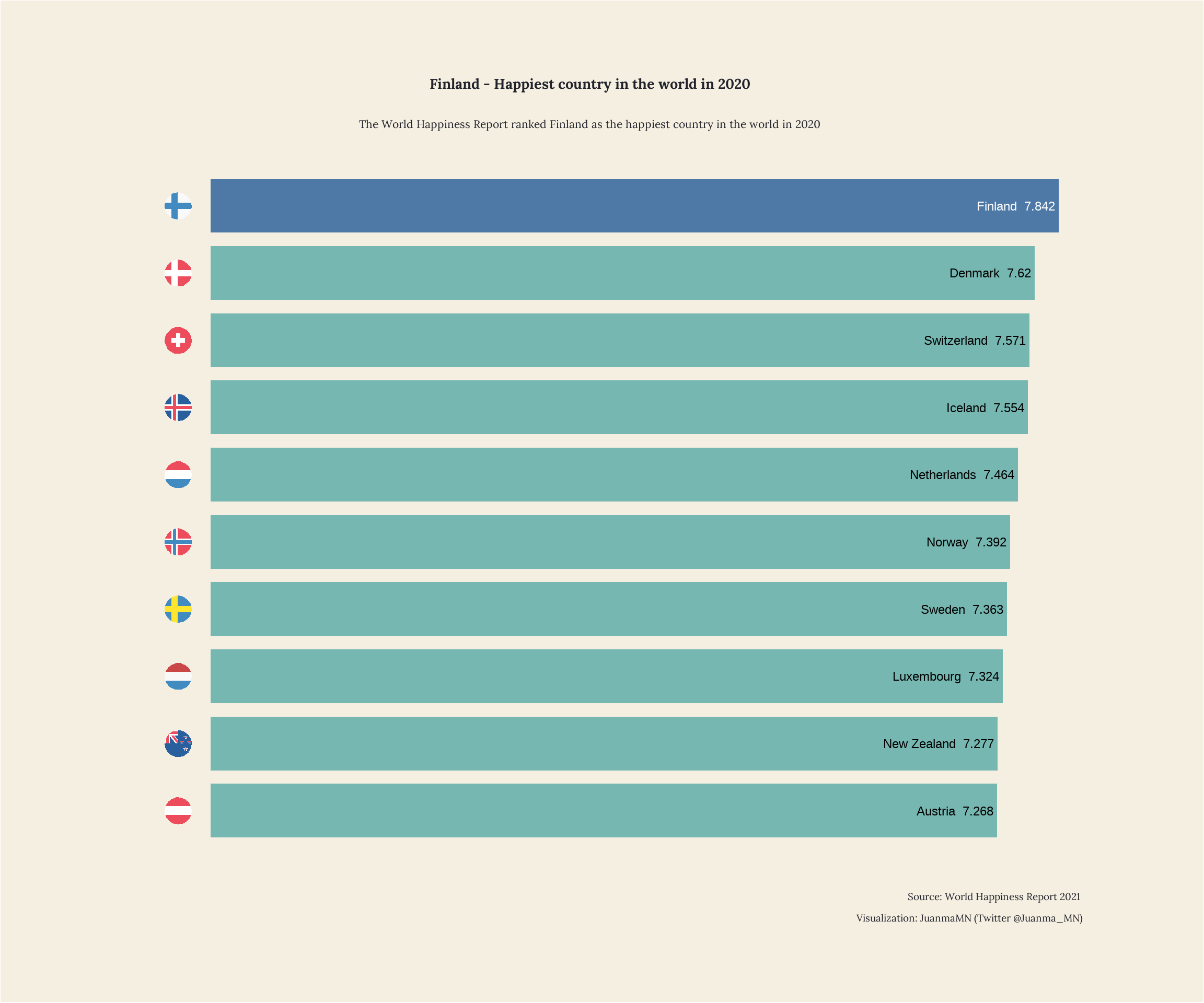 The below graph 1 shows the top 10 happiest countries according to the World Happiness Report.