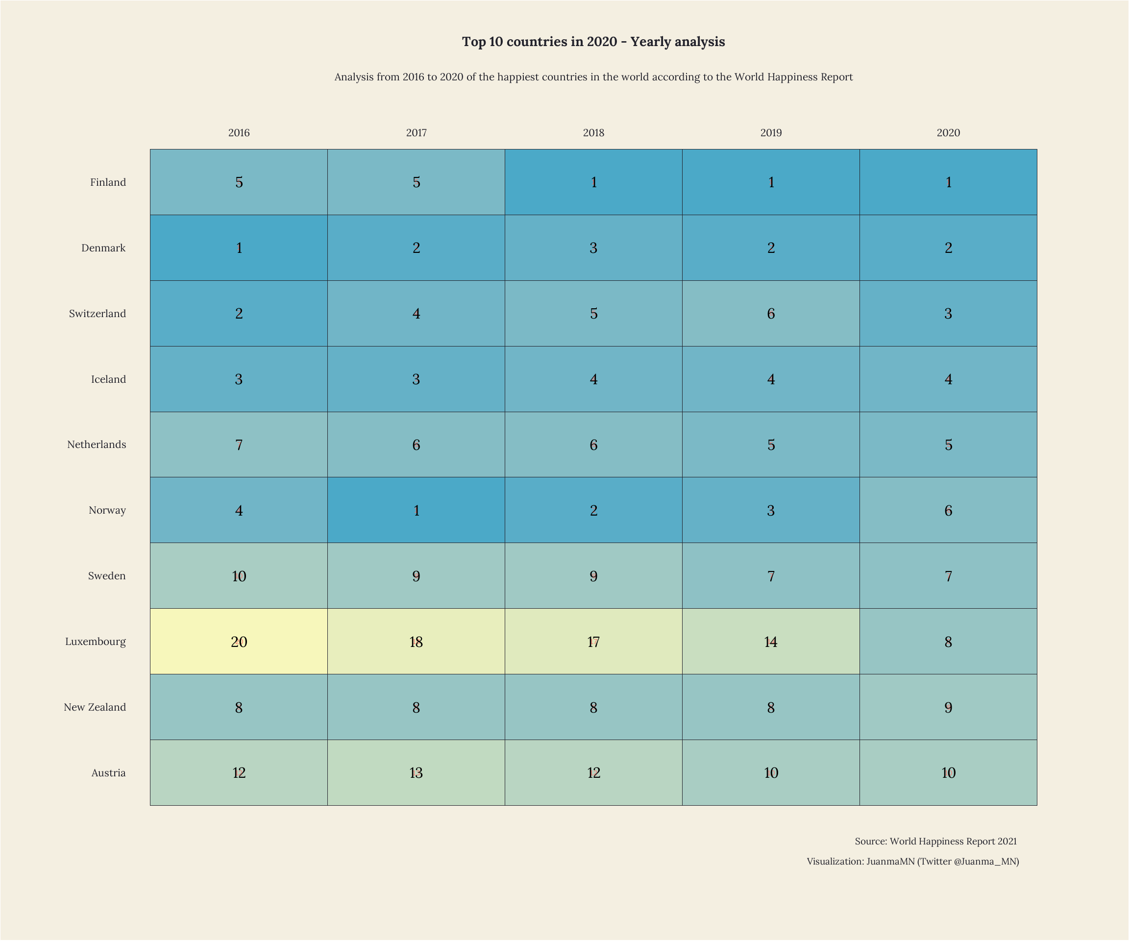 Three Nordics countries (Finland, Denmark and Iceland), with Finland first, finished in the top four. The Netherlands and Switzerland completed the top five in 2020.