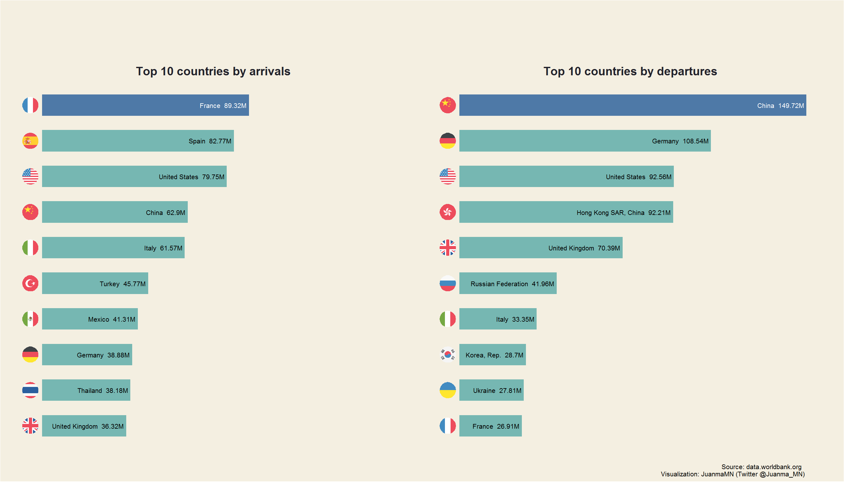 The below graph shows the top 10 countries by number of arrivals and departures in 2018.