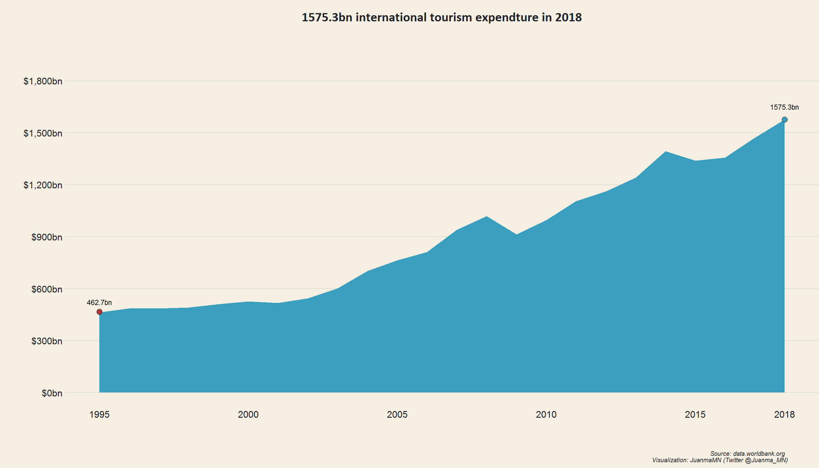 The below graph shows the total expenditure by international tourism in all countries from 1995 to 2018.