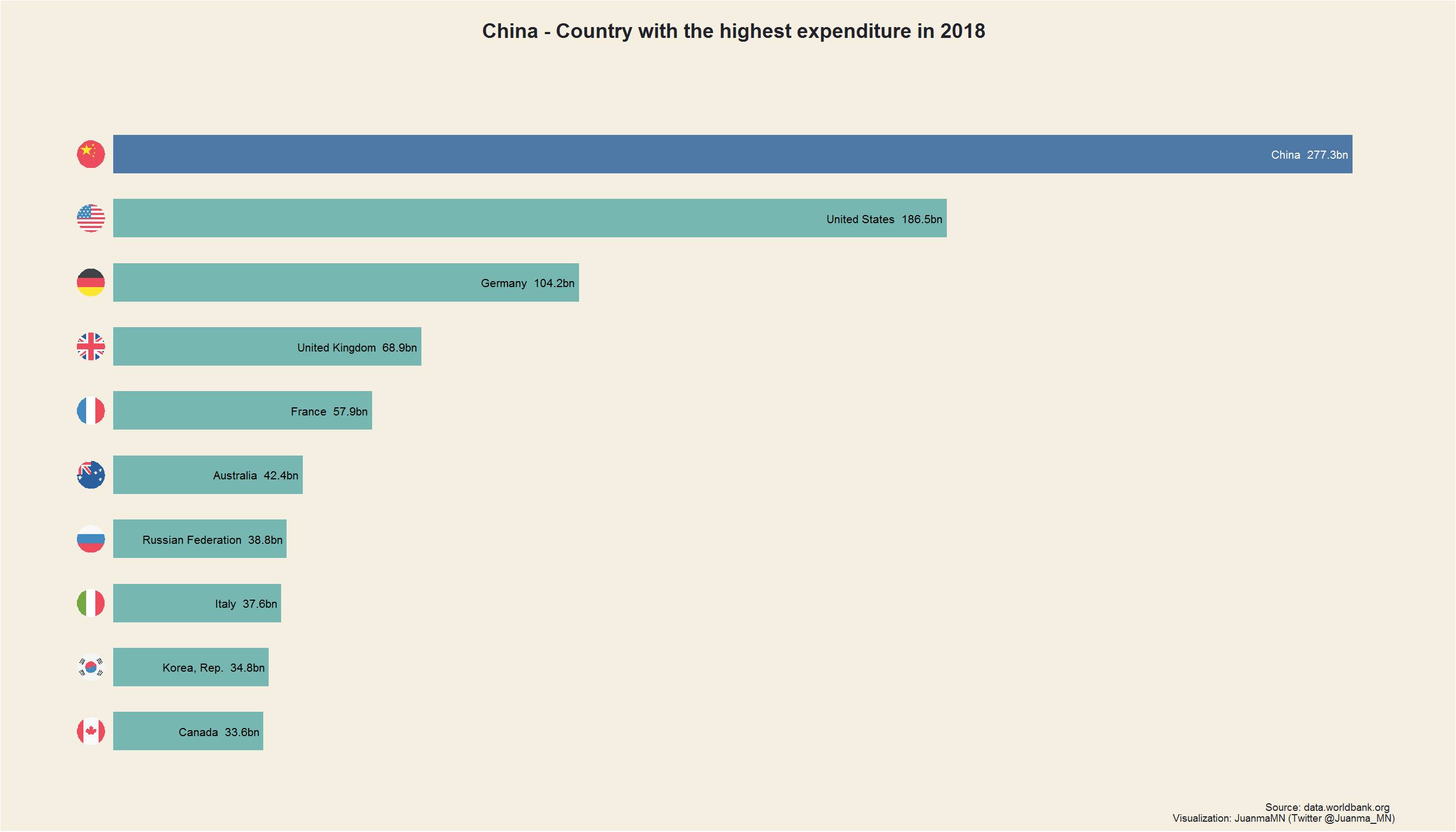 China ranked first with $277.3b in international tourism expenditure followed by the United States of America (USA) with $186.5b and Germany with $104.2b in 2018.