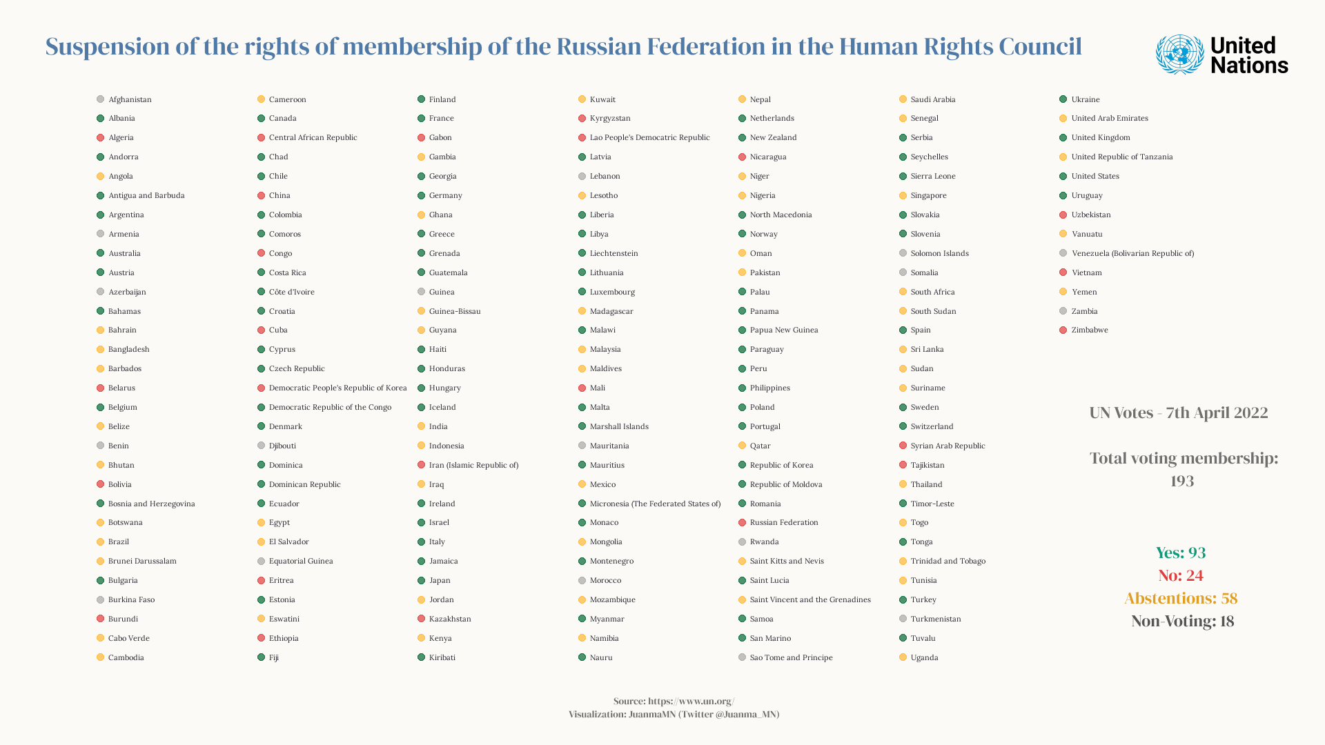 On April 7th 2022, The United Nations General Assembly adopted a resolution calling for Russia to be suspended from the Human Rights Council.